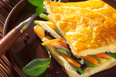 - Spoon the vegetables on to the opened, warm puff pastry and serve hot.
