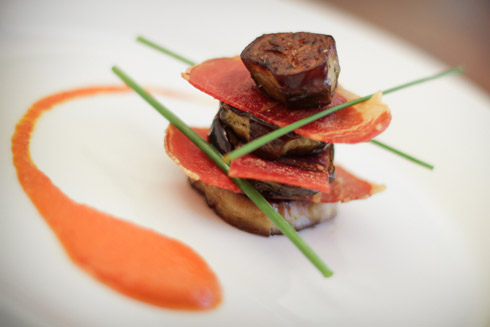 - To serve, stack three slices of eggplant alternatively with 3 slices of ham in the center of the plate